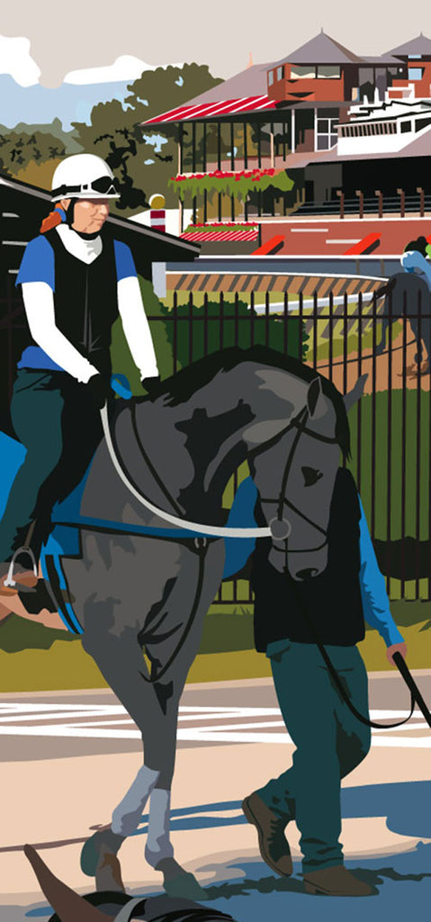 The result is “First Light,” paying homage to the Whitney family with this image of an early morning workout on the Oklahoma track in Horse Haven, on the north side of Union Avenue. With the dawn and the muffled beat of horse hoofs, exercise riders race past the Whitney Viewing Stand, in itself a reverent nod to days gone by. We’re hoping that you enjoy this more classic artwork tending toward my earlier silk screens. The luminous yellow of the warmth of August mornings will hold many memories for those of us who enjoy the magical racing season.